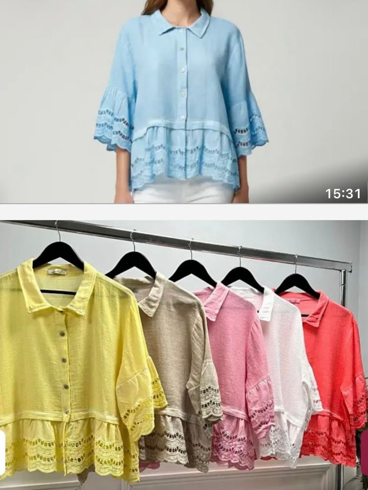 Waffle Look Blouse With Broderie Anglaise Hem & Sleeve