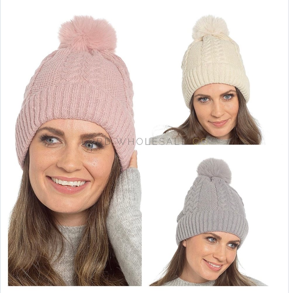 Ladies Cable Hat With Fleece Lining & Pom Pom
