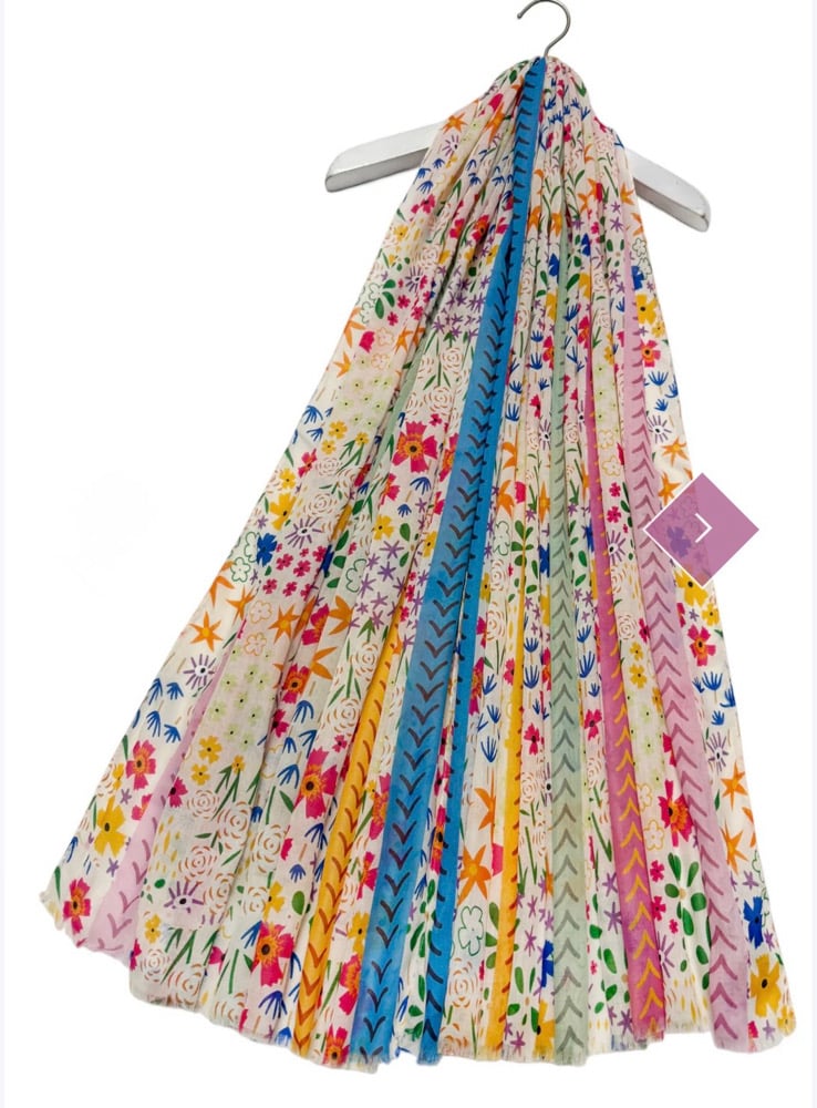 Playful Illustrated Flower & Stripe Frayed Scarf